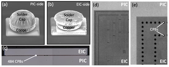 CPBs typically have a diameter of 20–30 μm, and are formed by Cu electro-plating of under-bump metal-pads on the PIC and EIC, followed by the deposition of a (lead-free) Sn-Ag-Cu solder-cap. The PIC and EIC are vertically integrated by aligning the matching pairs of CPBs on both chips using the beam-splitter camera of a flip-chip system; bringing the two chips into contact; and then applying a thermo-compression or solder-reflow cycle to fuse together the paired solder-caps. These solder-caps will be coated by a native-oxide layer that must be removed to ensure a good electrical and mechanical interconnect is formed [51]. The traditional solder-fluxes used in electronic packaging are generally not applicable in photonic packaging, because they can leave chemical residue that contaminates the optical interfaces for Fiber-to-PIC coupling. This can lead to increased insertion losses and also a weakening of the mechanical Fiber-to-PIC bond. Instead, a ‘no clean’ flux should be used during the solder-reflow bonding. This flux is VOC-free (volatile organic compounds) and activates and evaporates at the melting-point of the solder [52], so it does not require a post-bonding solvent-rinse that can contaminate the PIC [53,54].