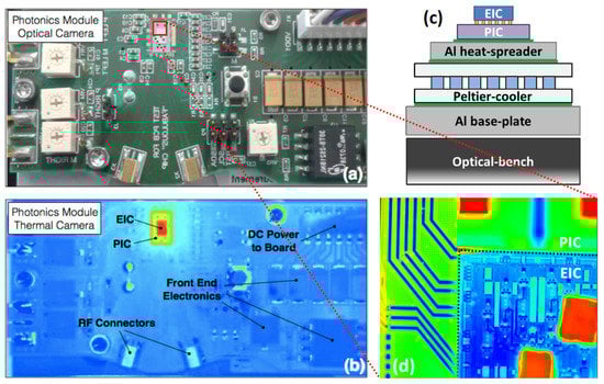 Thermal imaging of a photonic module and PIC; (a,b) A comparison of optical and thermal imaging of the optical network unit (ONU) packaged for the FP7-FABULOU project. Once powered-up, both the EIC and PIC experience a significant increase in temperature (34 °C and 20 °C, respectively); (c) Schematic of the ‘thermal stack’ in the ONU, showing the conduction path from the EIC to to the baseplate; (d) Thermal microscopy of the EIC and PIC on the ONU. Silicon is transparent in the 3–5 μm wavelength range at which the sensor operates, allowing the user to ‘see through’ the EIC substrates and image the metallic structures on the surface of the EIC and PIC.