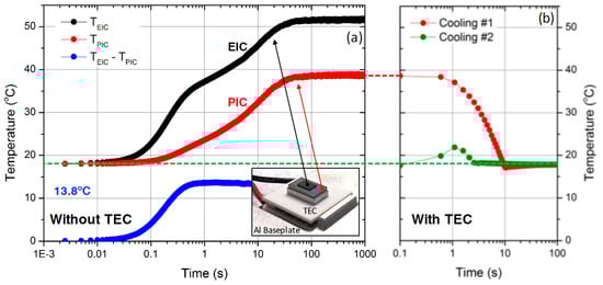 Temperature changes of the EIC and PIC in the FP7-FABULOUS optical network unit (ONU) from the thermal microscope analysis; (a) The increase in EIC and PIC temperature, when the ONU is powered-up, and the TEC (thermo-electric cooler) is not activated. After 30 s, the PIC temperature reaches a steady-state at 20 °C above the ambient; (b) Once the TEC is activated (in Cooling#1), the hot PIC rapidly returns to the ambient set-point temperature, reaching ±0.1 °C of the set-point in 30 s. In Cooling#2, the ONU and TEC are powered-up at the same moment, and the PIC never exceeds the set-point by more than 5 °C.
