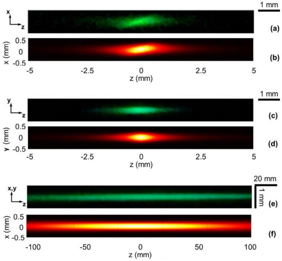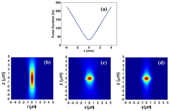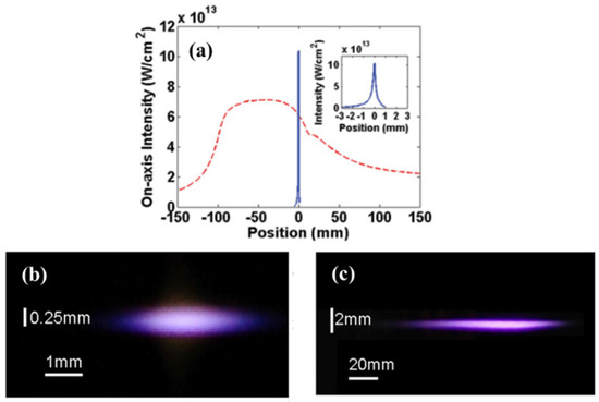 - He, F.; Zeng, B.; Chu, W.; Ni, J.; Sugioka, K.; Cheng, Y.; Durfee, C.G. Characterization and control of peak intensity distribution at the focus of a spatiotemporally focused femtosecond laser beam. Opt. Express 2014, 22, 9734–9748. [Google Scholar] [CrossRef] [PubMed]