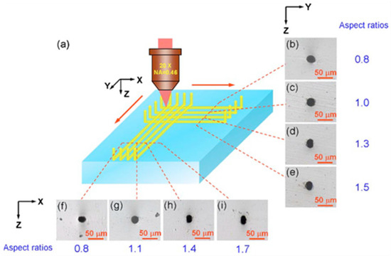 - He, F.; Cheng, Y.; Lin, J.; Ni, J.; Xu, Z.; Sugioka, K.; Midorikawa, K. Independent control of aspect ratios in the axial and lateral cross sections of a focal spot for three-dimensional femtosecond laser micromachining. New J. Phys. 2011, 13. [Google Scholar] [CrossRef]