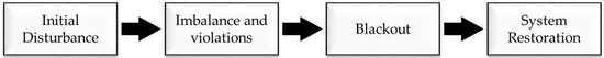 The current bulk power systems require a high level of reliability. To improve the reliability of a power grid, system operators analyze N-1 contingencies, monitor the system margins and develop new technologies such as High Voltage Direct Current (HVDC) and Flexible AC Transmission Systems (FACTS) which have been introduced. Nevertheless, there is the possibility of total and partial blackouts. According to recent blackouts [1,2], large blackouts can be described as cascading outages, as shown Figure 1. Cascading outages occur sequentially, and they are caused by an initial disturbance. The initial disturbance includes natural disasters, unexpected accidents, misoperation of a facility and imbalanced power systems. It causes sequential trips of facilities such as transmission lines, transformers and generators. Sequential outages are propagated until the system fails to recover due to voltage instability and thermal violations which are alleviated or drop below the operating limits. Eventually, a partial or total blackout occurs. Once the blackouts have occurred, the appropriate system restoration should be performed.