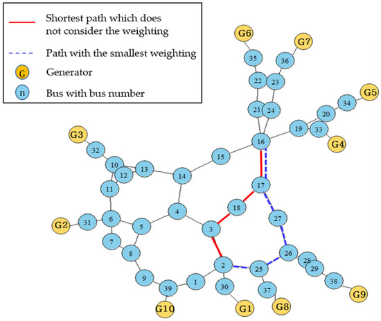 For example, in Figure 3, if we find the paths from bus 2 to 16, we can consider two different paths. The one that is marked with the red line is the shortest path which does not consider the weighting factor, while the other that is marked with the blue dashed line is the path with the smallest weighting. Even though the red line is shorter, we will select the blue dashed line. The blue and yellow balls illustrated in Figure 3 represent the buses with bus numbers and generators respectively.