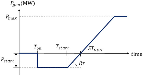 When supplying power from the grid at time , the generator starts power generation after the time required for cranking the generator. In the case of a black start unit that can be started without any external power from the power system, the value is zero. Once the generator starts power generation at time , it generates the power up to the maximum power according to its ramp rate, .