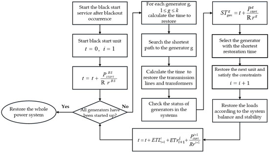 We will propose a new sequential restoration strategy, as shown in Figure 5. First, if a blackout occurs, the restoration process is started. We set the recovery time and the restoration step . In the next stage, the black start unit is started, and we confirm the generator that can be restored in the next step. If all generators are restored, the flow is terminated. Otherwise, the flow is continued to determine the generator start-up sequence (GSS), and the start-up time of each generator to be restored is calculated. At this time, the time taken to re-energize the transmission lines and transformers is calculated. To consider this, we search for the shortest path to the generator by considering the charging currents as a weighting factor. The time taken to restore the transmission lines and transformers is calculated by counting the amount of equipment in the path and multiplying it by a certain value. Afterwards, we compute the time to re-start the generator in accordance with the generator characteristic data. By adding the respective times that are calculated, the generator with the shortest restoration time is selected for the next unit. During the process of restoration, the constraints expressed in Equations (5)–(7) must be satisfied. Unless the constraints are satisfied, the corrective actions such as power generation or load adjustment should be performed. The restoration of the next unit is started, and the load is restored in order to maintain the system balance and stability. At this time, the sum of the time to re-energize transmission lines and transformers and the time until the generator can supply the power is added to the recovery time. In the same way, the flow of the GSS is repeated until the available generators exist in the systems.