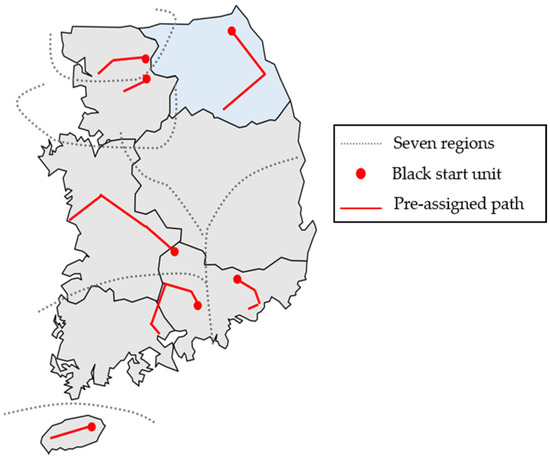 In Korea, when a total blackout occurs, the whole system is divided into seven regions to restore the whole system (Figure 6). Each subsystem has at least one black start unit and pre-assigned paths. Black start units are usually hydroelectric power or pumped storage power. If a blackout occurs, the black start unit and pre-assigned paths are restored first. After the black start unit and pre-assigned paths are restored, the rest of the generators are ordered to be restored.