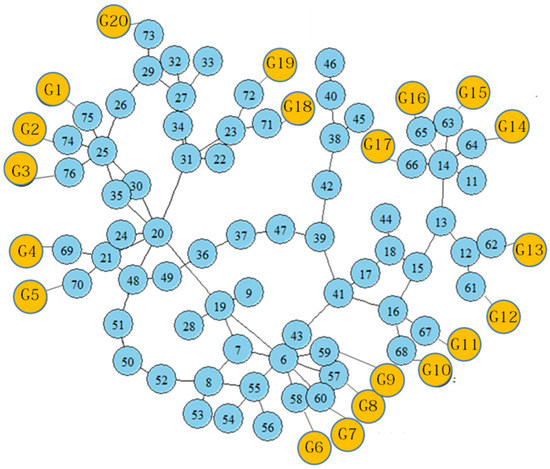 Table 2 shows an example of the GSS in the eastern regions of South Korea. means the start-up time for each generator, and is the energizing time of the transmission lines and transformers for restoring the generator. Total means the total time taken to restore the generator, including the time taken to restore the transmission lines and transformers. The highlighted cells are the generators that are selected as the next units in each step. In the eastern regions, the pre-assigned paths are G6 (Black start unit) →58→6→19→20→30→25→26→29→73→G20, and G6 is started as the black start unit in the first step. In the second step, G20 is started as well. Afterwards, we calculate the total times for all available generators and compare them. In the third step, G7, which has the shortest total time, is restored. At the end of the third step, the total times of all generators are compared again, and in the next step, G8 is restored. G7–G9 are sequentially restored, since these are located near each other and are the same type. In the same way, the restoration sequence is repeated until the available generators exist in the systems.