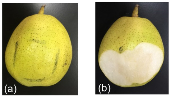 Korla pears were purchased from a local market in Hangzhou in October 2015. One hundred twenty pears free from damage on surface and similar in size, were picked out as trial samples. Sixty samples were dropped from the height of 25 cm to the horizontal ground by artificial simulation and slight bruises were caused near the equator line of pears. These areas were difficult to be recognized by naked eyes but softer than normal areas. As shown in Figure 1a, the bruised area (in black frame) was similar to normal area around it. However, Figure 1b shows that when the peel of bruised area was cut off, there were obvious differences between normal and bruised area in color.