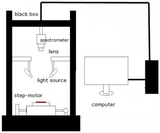 Schematic diagram of the hyperspectral imaging system. The system consists of a black box, spectrometer, lens, light source, step-motor and computer.