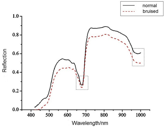 It can be seen from Figure 3 that the average reflectance of the damaged area was lower than that of the normal region in the 420 to 1000 nm spectral range. In addition, there were two obvious absorption peaks in the graph. The absorption peak at 680 nm is mainly caused by the absorption of chlorophyll on the surface of the fruit [21] which reflects the color information of the fruit surface, while the absorption peak near 960 nm is mainly caused by the water absorption [22].