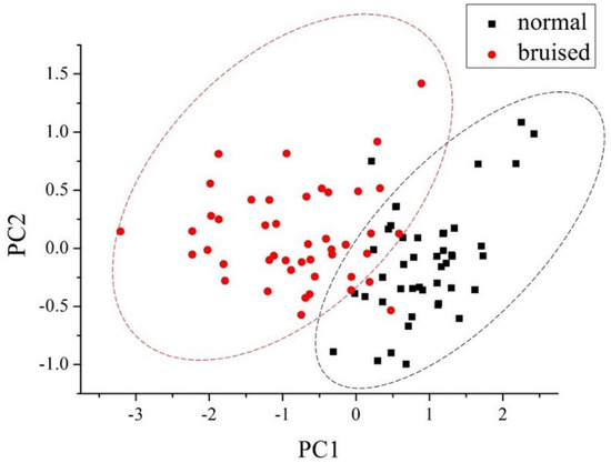 Principal component analysis (PCA) scores plots (PC1 vs. PC2) for modeling samples (45 normal samples in black and 45 bruised samples in red.
