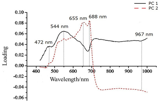 Figure 5 shows the loading plots of PC1 and PC2 in the spectral region of 420–1000 nm. The peaks and valleys of the loading plots indicated the importance of the wavelengths. Wavelengths 472, 544, 655, 688 and 967 nm were selected as the characteristic wavelengths. The first three wavelengths (472, 544 and 655 nm) were related to the color information of blue (around 450 nm), green (around 550nm) and red (around 650 nm); the wavelength of 688 nm represented the absorption of chlorophylls; the wavelength of 967 nm represented the absorption of water. As seen in Figure 1, the differences between water and color could be obviously visualized in the bruise region, indicating the efficiency of the characteristic wavelengths’ selection.