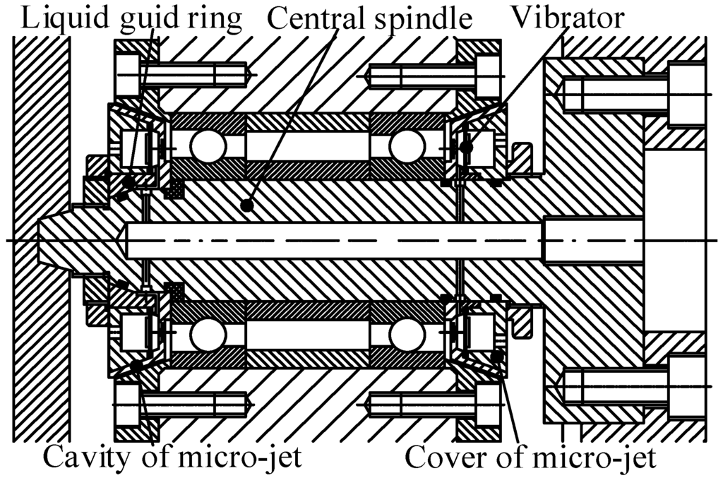 To realize the DOD lubrication of the gyroscope’s bearing system, we made full use of the space of the bearing system and embedded the piezoelectric micro-jets into it, as shown in Figure 2. The embedding of the micro-jets cause no change to the overall volume. In order to provide lubricating oil to the cavity of the micro-jet and decrease the total mass of the system, the central spindle was desgined as a hollow craft to be the lubricating oil supply channel such that the lubricating oil is transported to the interior cavity of the micro-jets through the lubricating oil supply channel, and, when the bearing lubrication is insufficient, the droplets of the lubricating oil are sprayed out to the bearings by the pressure waves that are generated by the vibrators.