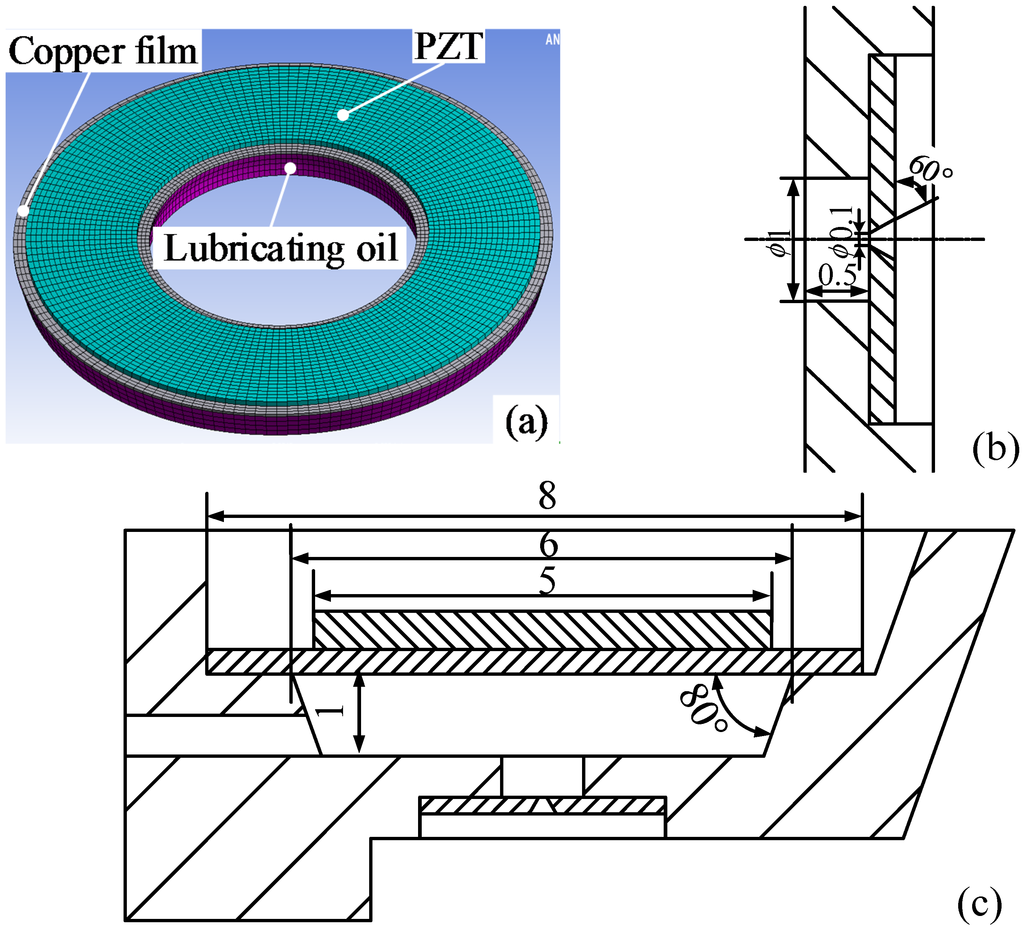 The piezoelectric vibrator was composed of piezoelectric ceramic and copper films; they were boned together and made as the two electrodes of the vibrator, respectively. The inner ring diameter of copper film and PZT were mm and mm, respectively. The whole finite element model of the micro-jet is shown in Figure 3a, and, since the micro-jet is a rotating body, we have simplified it here into a two-dimensional model. The main dimension of each part of the micro-jet is shown in Figure 3b,c.