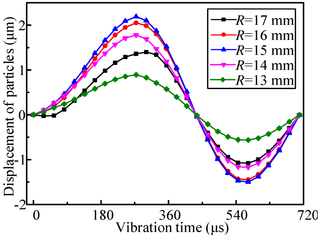 The displacement-time relation curves of particles with different radial position on the fluid-structure interface (R is the radius of the particle’s position).
