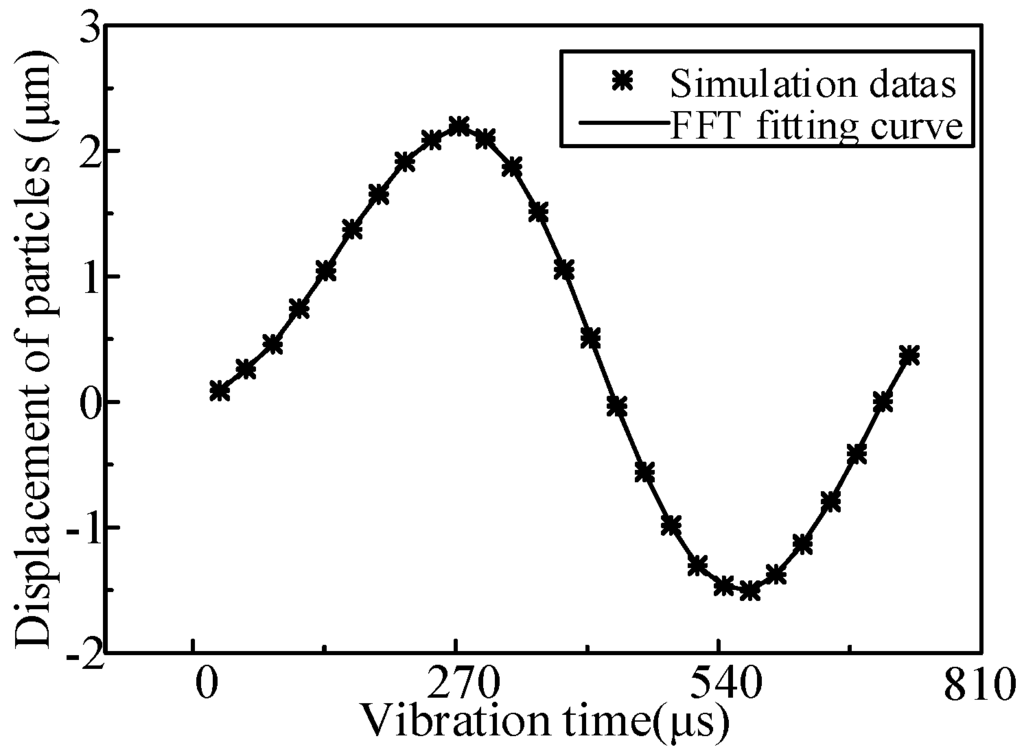 A numerical fitting model of a Fourier series function was adopted to fit the displacement-time relation curve of the particles with radius R = 15 mm, in accordance with the data of Figure 5, as shown in Equation (1). In the equation, is the vibration frequency and t represents the time. The fitting coefficients in the equation above are listed in Table 1.