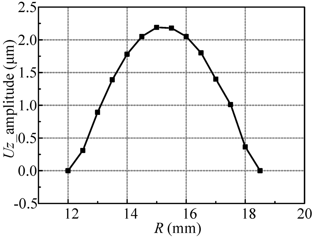 The displacement-time relation curves of particles with different radial positions on the fluid-structure interface were obtained, as shown in Figure 5. The square pulse voltages were selected, as the excitations with the frequency and amplitude were set to 1.83 kHz and 100 V, respectively.