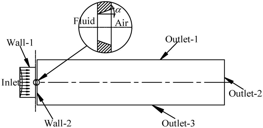 The left and right sides of the nozzle were set as fluid- and air-field respectively, and the divergence angle is set at 30° to correspond to the dimensions in Figure 3b. The inner wall of the cavity, Wall-1, is half-hydrophilic, and the contact angle was set at 85°. The air-liquid interface, Wall-2, is hydrophobic, and the contact angle was set at 165°. The velocity-inlet boundary conditions were set in accordance with Equation (5), and others were all set to have no slip boundaries. The density and dynamic velocity of the air were set at 1.1614 kg/m3 and 1.846 × 10−3 respectively, and the surface tension of the lubricating oil was set at 0.0725 N/m. The temperature was set at 20°, ignoring the influence of gravity. The structured quadrilateral cell was selected in this gas-liquid two-phase flow model, and the analysis type was set to have transient analysis.