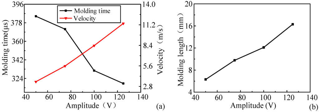 The changing curves of molding time and velocity corresponding to different amplitudes of the pulse voltage are shown in Figure 9a. As can be seen, with the increase of the voltage amplitude, the molding time decreased and the velocity increased gradually. Thus, we decided that, for a quick response to the lubrication, the amplitude of the pulse voltages should be raised to a certain range.