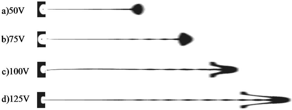 Setting the working frequency at 2.1 kHz, which was obtained in a previous test, the experimental injection states of the micro-jet under pulse voltages with different amplitude were obtained, as shown in Figure 17, when the duty ratio was set to 50%.