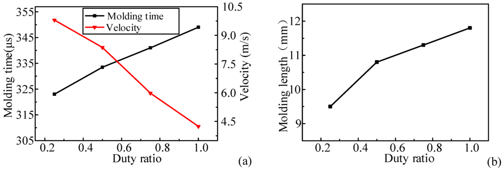 The changing curves of molding time and velocity under pulse voltages with different duty ratios are shown in Figure 11a. The figure demonstrates that the velocity reduced along with the increase of the duty ratio, while the molding time gradually increased. Therefore, we concluded that, in a certain range, the duty ratio of the pulse voltages should be raised so as to improve the response time of the lubrication.