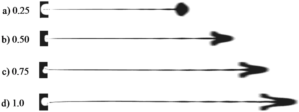 When the working frequency and amplitude were set to 2.1 kHz and 100 V respectively, the experimental injection states of the micro-jet under pulse voltages with different duty ratios were obtained, as shown in Figure 19. With the rising duty ratio of the pulse voltages, the lateral injection distance and the level of the dispersion of the droplets all increased gradually, which corresponded to the results of the simulation. In addition, through these experiments, we found that the micro-jet cannot work properly when the duty ratio of the pulse voltages is less than 20% or more than 70%. The main reason is that the mechanical responses of the vibrator requires a certain time; if a duty ratio of the pulse voltages is too high or too low, the vibrator will be unable to deform or return to its natural state.