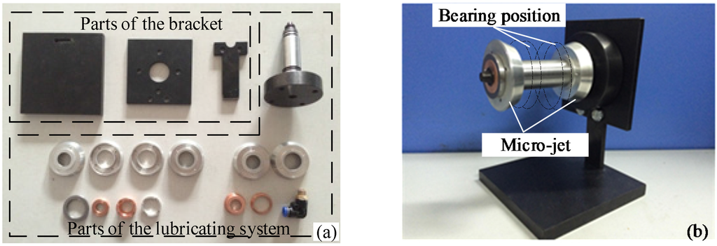 The experimental device of the piezoelectric micro-jet lubricating system: (a) The parts of the device; (b) The assembly of the device.