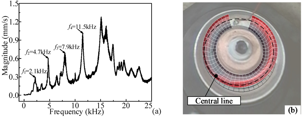 In this experiment, the amplitude of the pulse voltages was set at 100 V, and the properties of the lubricating oil filled in the cavity of the micro-jet were the same as what was set in the simulation. The vibration velocity response spectrum and first-order vibration shape of the piezoelectric vibrator were obtained by the scanning vibrometer, as shown in Figure 15.