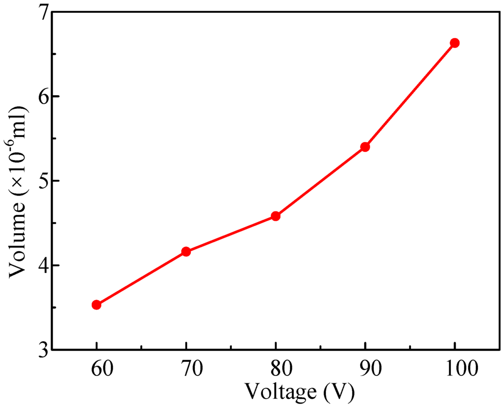 The relationship curve of the single droplet’s volume and the amplitude of pulse voltages is shown in Figure 18. It appears that the volume increased slowly before 80 V and then changed quickly, which means that the influences of the amplitude were enhanced after 80 V. The minimum volume of the droplets was 3.53 × 10−6 mL when the amplitude of the pulse voltages was set to 60 V.