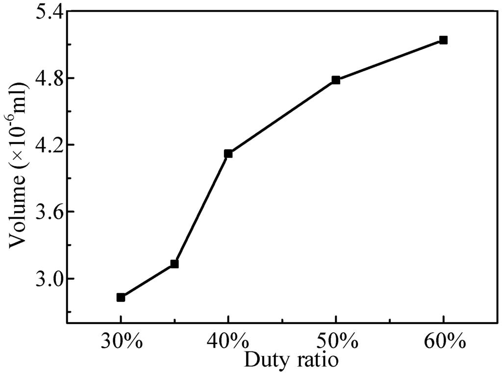 Figure 20 shows the relationship between a single droplet’s volume and the duty ratio of pulse voltages. As we can see, the volume increases slowly with the increase of the duty ratio, but the change gradually slows down. The minimum volume of the droplets is 5.14 × 10−6 mL when the duty ratio of the pulse voltages is set to 30%.