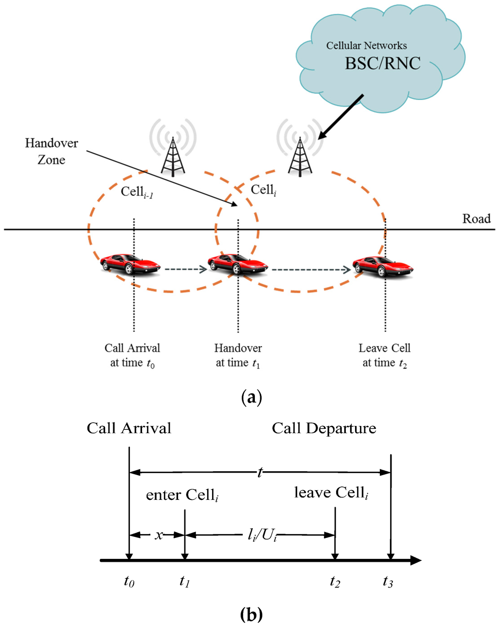 Figure 1a illustrates the space diagram for vehicle movement and the handover on a road. Figure 1b depicts the timing diagram for the handover on the road segment covered by Celli. The MS in a car performs the call set-up at time t0 (in Figure 1a,b); then, the MS goes into the handover area of the coverage of Celli−1 and Celli at time t1 (in Figure 1a,b), and the base station controller (BSC) or radio network controller (RNC) will allocate an available channel for the communicating MS. At this moment, if Celli has a free channel, the connection between the MS and Celli will be established successfully. The process is called a handover from Celli−1 to Celli.