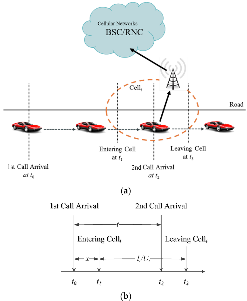 Figure 3a depicts the scenario diagram for vehicle movement and call arrivals on the road. Figure 4b shows the timing diagram for call arrivals on the road segment covered by a specific Celli. The MS in a car moving along the road performs the first call at time t0 (in Figure 3a,b) and enters the coverage area of Celli at time t1 (in Figure 3a,b). The MS performs another call at time t2 (in Figure 3a,b) before leaving Celli (time t3 in Figure 3a,b), and the call performed by the MS is called a call arrival in Celli.