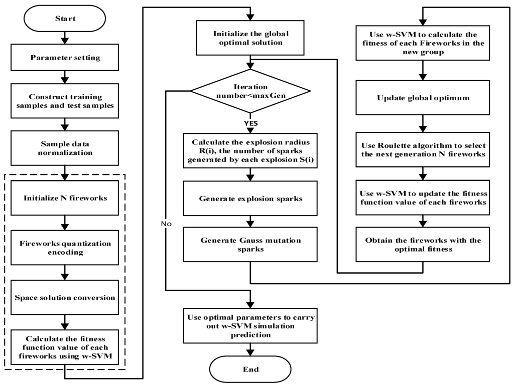 It is extremely important to select the parameters of w-SVM which can affect the fitting and learning ability. In this paper, the constructed quantum fireworks algorithm (QFA) is used for selecting the appropriate parameters of the w-SVM model in order to improve the icing forecasting accuracy. The flowchart of QFA for parameter selection of the fireworks the w-SVM model is shown in Figure 1 and the details of the QFA-w-SVM model are shown as follows: