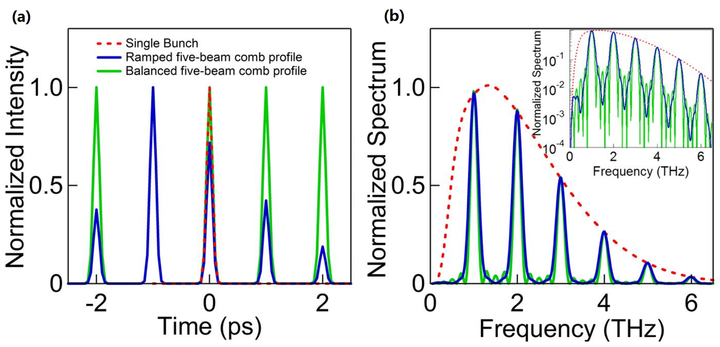 Numerical calculation of terahertz (THz) generation by a train of ps-spaced bunches: (a) Bunch profile: single bunch (red dotted line), five-bunch comb beam (green curve), five-bunch comb beam with ramp charge distribution (blue curve). The bunch length is 100 fs, while the comb inter-distance is 1 ps equal to a repetition rate of 1 THz; (b) Corresponding generated spectra. Inset: spectra generated in logarithmic scale.