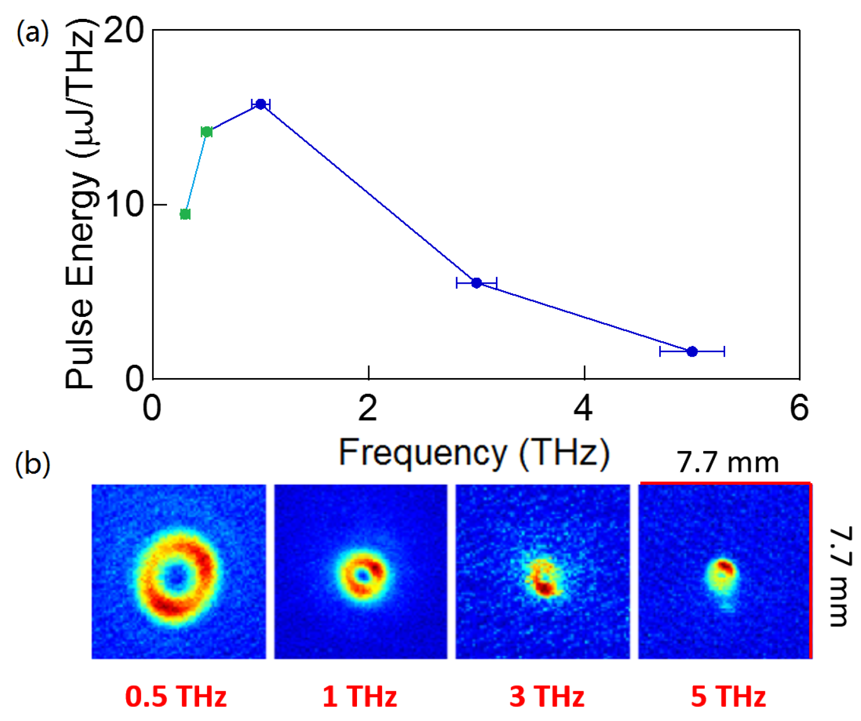 Broadband THz generation: (a) spectral distribution sampled by THz filters. The error bars represent the bandwidth of the bandpass filters; (b) Transverse intensity distributions of CTR in the focus of the parabolic mirror for different wavelength. Since the used power meter (THz-I-BNC GENTEC-EO) is not calibrated for frequencies below 0.61 THz, the measured energy for frequencies below this value is a qualitative assessment.