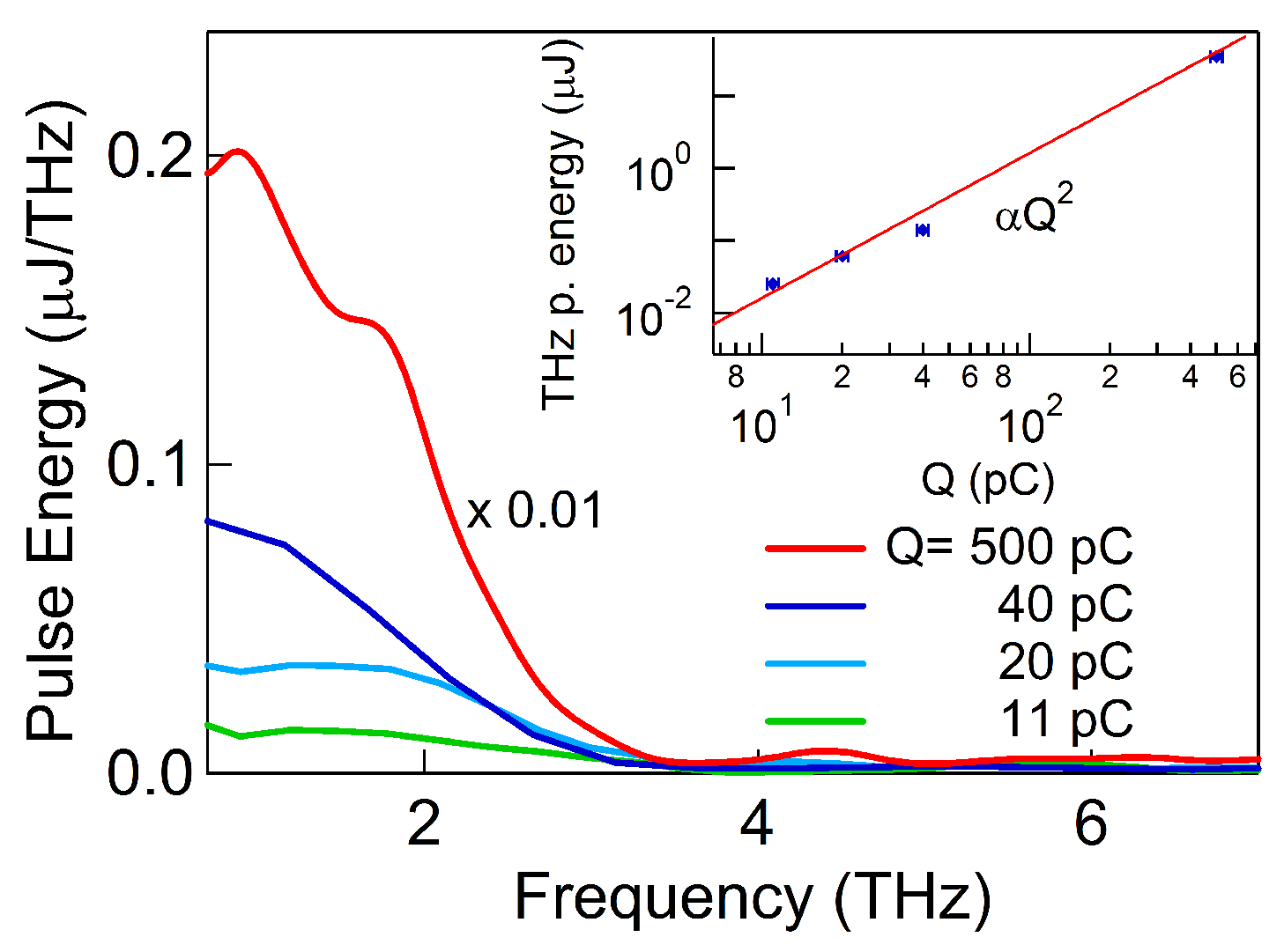 Low charge regime: Spectral distribution intensity measured by Michelson interferometer for different bunch charge Q. Inset: generated THz energy per pulse as a function of bunch charge Q. The curve for the highest bunch charge (500 pC) has been scaled by a factor of 100. Experimental data (blue dots), Q dependence (red line). The integrated THz intensities per pulse shown in the inset are affected by a systematic uncertainty due to the missing calibration of the THz-I-BNC GENTEC-EO pyroelectric detector at low frequencies (below 0.6 THz).