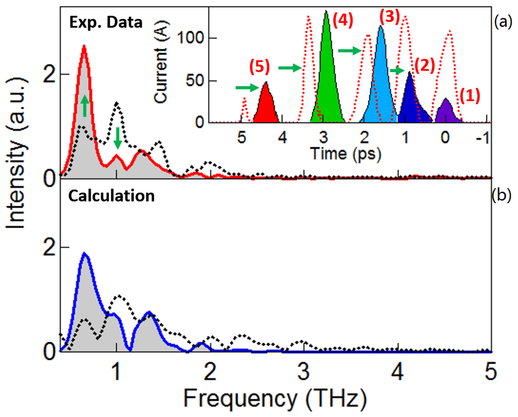 THz generation by a five comb beam reducing the inter-distance of the last two bunches from 1.6 ps to 0.6 ps. (a) Measured spectrum is shown through red curve is compared to that obtained with 1.6 ps of inter-distance (black dotted curves); (b) Numerical calculation from measured current distributions reported in the inset: inter-distance 0.5 ps (blue curve) and inter-distance 1.6 ps (black dotted curve).