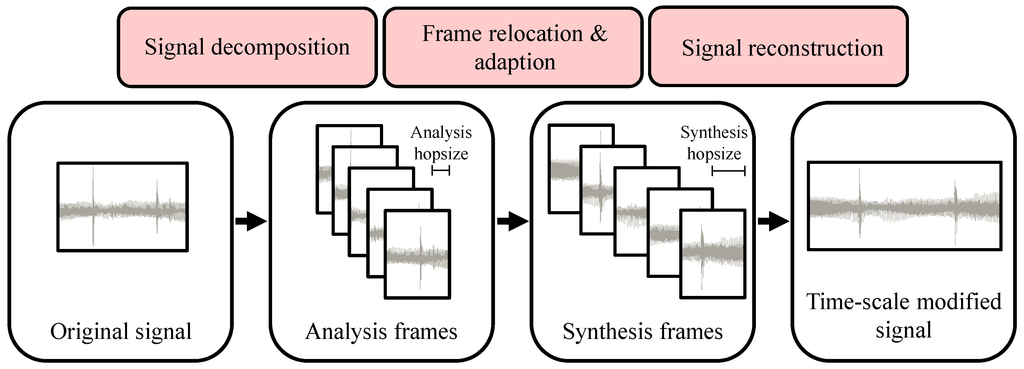 Generalized processing pipeline of Time-scale modification (TSM) procedures.