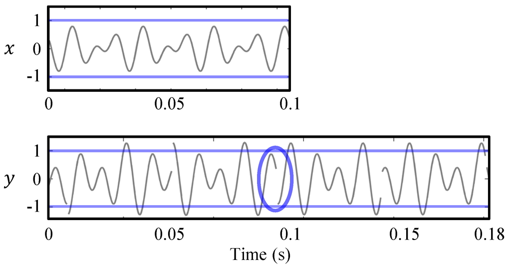 Typical artifacts that occur when choosing the synthesis frames to be equal to the analysis frames . The input signal x is stretched by a factor of . The output signal y shows discontinuities (blue oval) and amplitude fluctuations (indicated by blue lines).