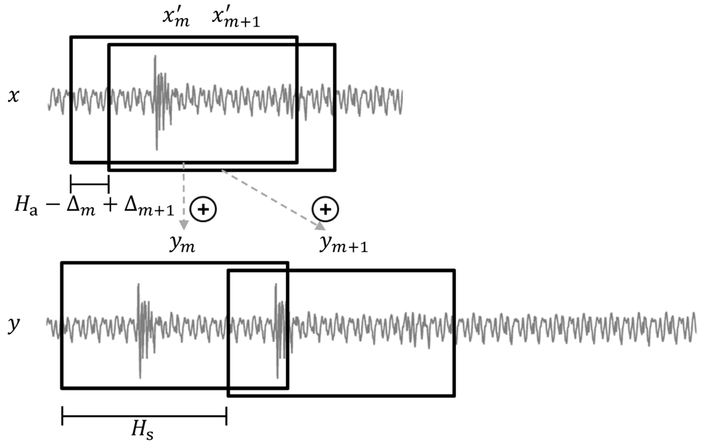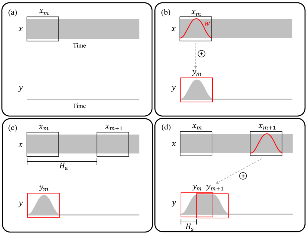 The principle of TSM based on overlap-add (OLA). (a) Input audio signal x with analysis frame . The output signal y is constructed iteratively; (b) Application of Hann window function w to the analysis frame resulting in the synthesis frame ; (c) The next analysis frame having a specified distance of samples from ; (d) Overlap-add using the specified synthesis hopsize .