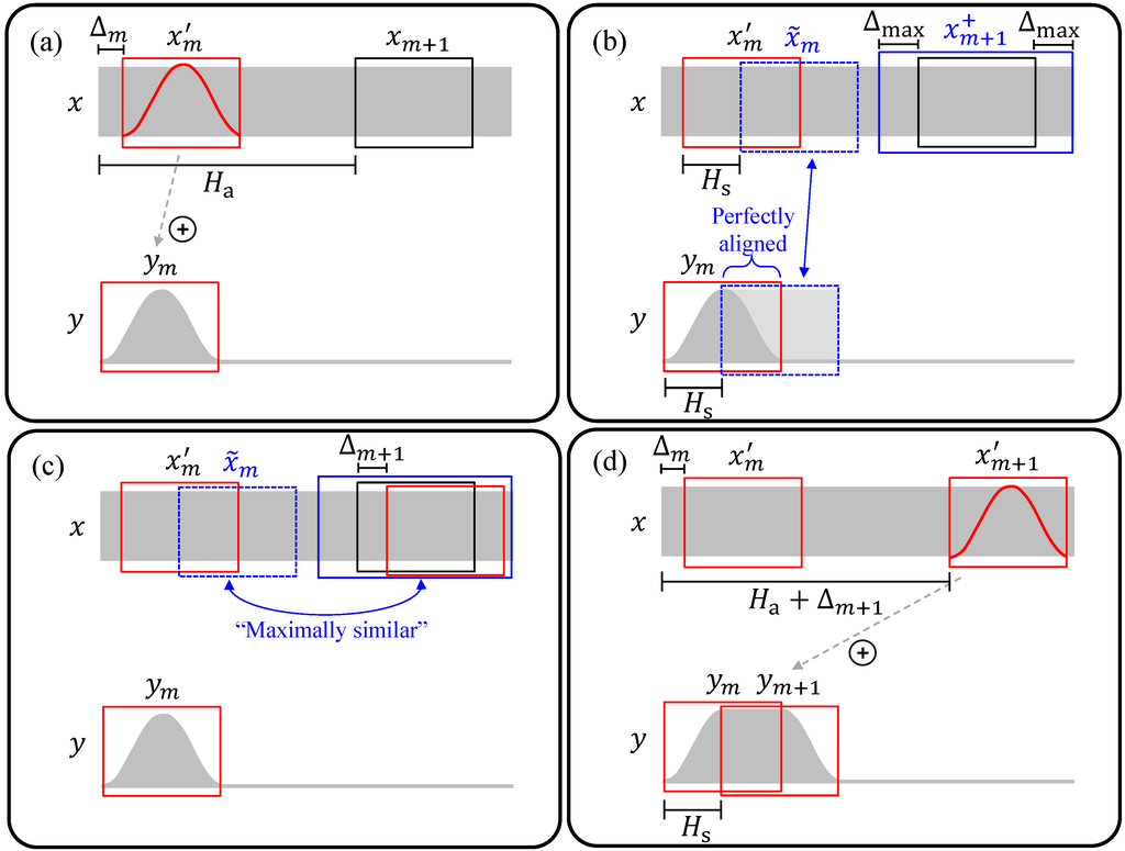 The adjusted analysis frame is windowed and copied to the output signal y as in OLA (Figure 5a). Now, we need to adjust the position of the next analysis frame . This task can be interpreted as a constrained optimization problem. Our goal is to find the optimal shift index such that periodic structures of the adjusted analysis frame are optimally aligned with structures of the previously copied synthesis frame in the overlapping region when superimposing both frames at the synthesis hopsize . The natural progression of the adjusted analysis frame (dashed blue box in Figure 5b) would be an optimal choice for the adjusted analysis frame in an unconstrained scenario: