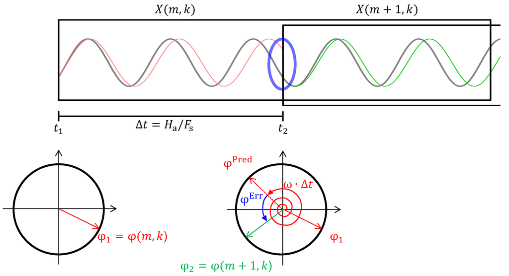 Each time-frequency bin of an STFT can be interpreted as a sinusoidal component with amplitude and phase that contributes to the analysis frame of the input signal x. However, the Fourier transform yields coefficients only for a discrete set of frequencies that are sampled linearly on the frequency axis, see Equation (14). The STFT’s frequency resolution therefore does not suffice to assign a precise frequency value to this sinusoidal component. The phase vocoder is a technique that refines the STFT’s coarse frequency estimate by exploiting the given phase information.