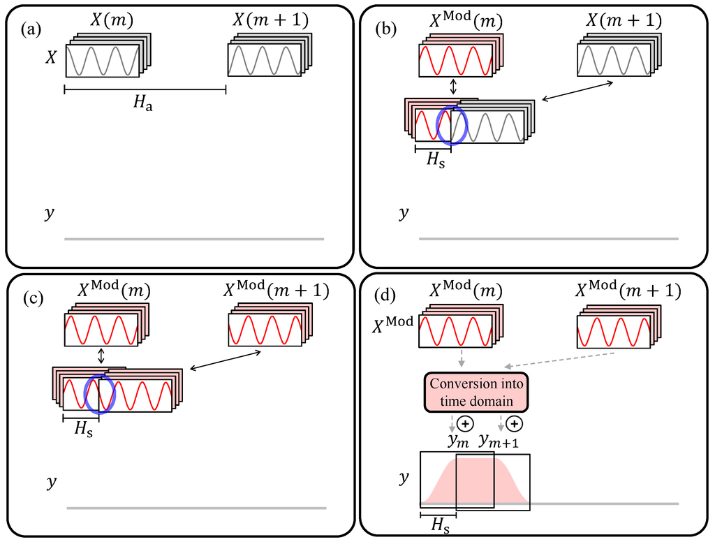 for all . The principle of the iterative OLA procedure is visualized in Figure 3. For the frame index , we first use Equation (1) to compute the analysis frame (Figure 3a). Then, we derive the synthesis frame by