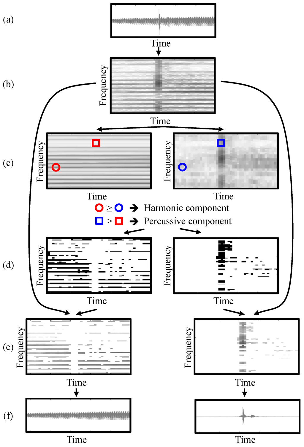 The HPS procedure presented in [23]. (a) Input audio signal x; (b) STFT X of x; (c) Horizontally and vertically enhanced spectrograms and ; (d) Binary masks and ; (e) Spectrograms of the harmonic and the percussive component and ; (f) Harmonic and percussive components and .
