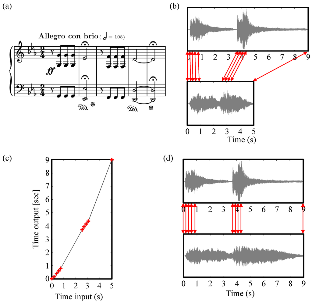 (a) Score of the first five measures of Beethoven’s Symphony No. 5; (b) Waveforms of two performances. Corresponding onset positions are indicated by red arrows; (c) Set of anchor points (indicated in red) and inferred time-stretch function τ; (d) Onset-synchronized waveforms of the two performances.