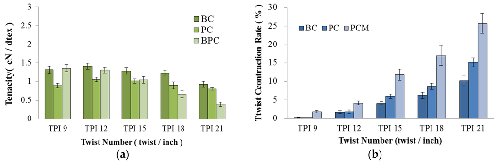 Figure 4 shows the effect of twist number on the tensile tenacity and twist contraction of complex yarns. Twisting gives yarn mechanical strength. Figure 4a shows that with increase of the twist number, tensile tenacity increased to a certain value and then decreased. BC and PC complex yarn twisted at 12 TPI had the highest tensile tenacity. For BPC yarn, tensile tenacity slightly decreased from 9 to 12 TPI and then continued to decrease largely with twist number. With the increase in twists per inch, the outer layer of fiber gradually pushed into the interspace of inner yarn, and the cohesive force between fibers evidently increased and led to yarn compactness and higher tenacity [21]. However, when the twist number exceeded 12 TPI, the inner yarn did not have sufficient space to hold more fibers, and the outer yarn appeared to fracture, which reduced tensile tenacity [21]. The tensile tendency of BPC yarns to twist number differed from those of the BC and PC complex yarns. This finding was due to the fact that BC and PC shell yarn generated higher compression to the core yarn, and the cohesive force between outer and inner yarn was non-uniformly distributed and easily produced stress concentration, which resulted in decreased tensile tenacity at a lower twist number.