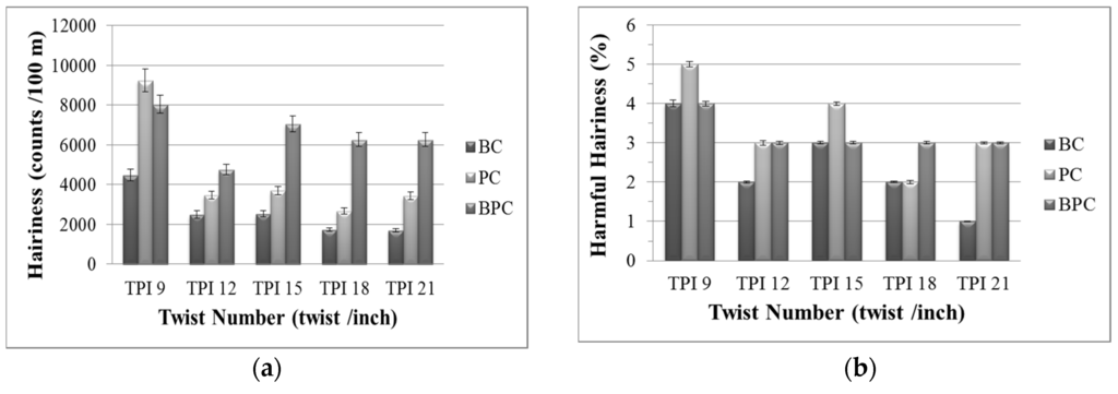 Table 2 shows the hair length and its distribution of ring-spun complex yarns. The total hairiness and harmful hairiness of complex yarns are shown in Figure 5a,b. Except for yarns twisted at 9 TPI, the hairiness of the BPC ring-spun yarn was much higher than those of BC and PC yarns; moreover, with increase of the twist number, overall hairiness gradually decreased. The former was due the fact that higher content of staple fiber was used as the outer layer of yarns during spinning and more hairs were exposed. The latter was due to the fact that twisting caused the outer staple fibers to be wrapped into the inner, the number of fiber ends decreased and the original hair length was shortened [23].