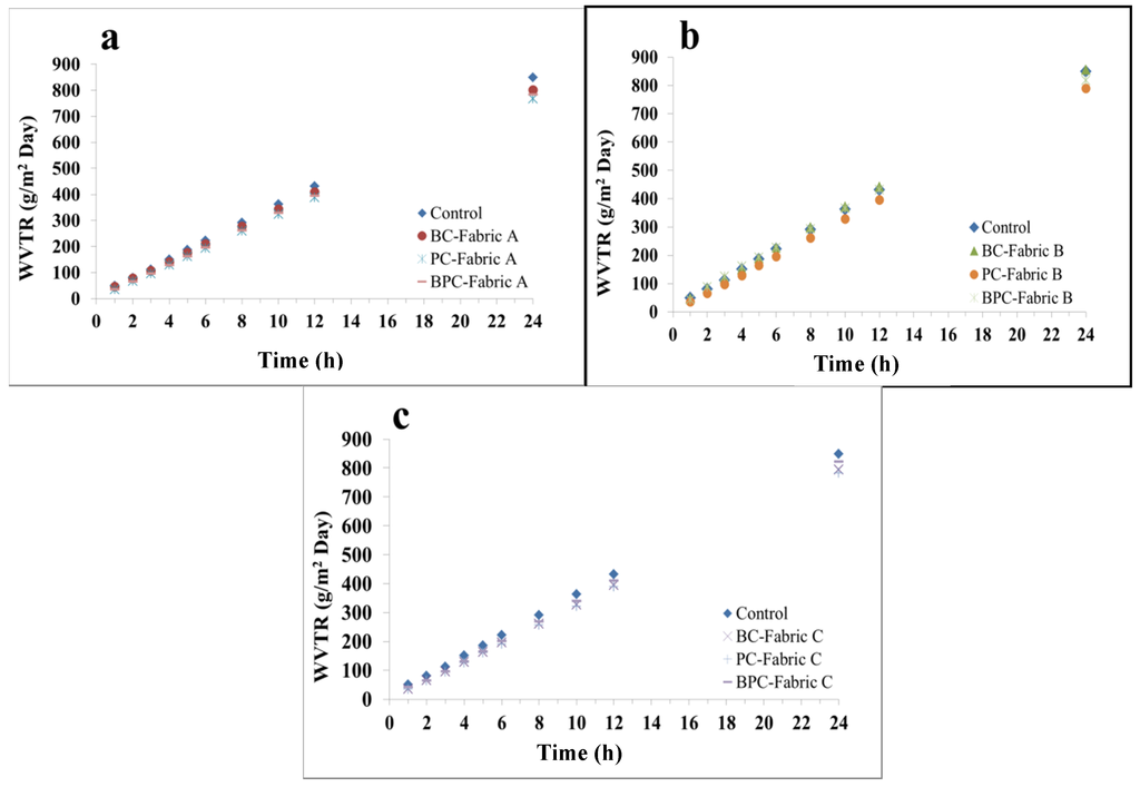 Based on the above, the value of WVTR of all fabrics reached 699–876 g/m2 day. According to literature, the WVTR of human skin under dry condition was 215 g/m2∙Day, but that of skin under wet condition reached 350 g/m2∙Day [29,30]. Therefore, the elastic fabrics showed two times higher value of WVTR than wet human skin. The air permeability of Fabric B composed of BC and PC yarns achieved 73.2 cm3/s/cm2, four times higher than that of plain woven fabrics made by filaments based on ASTM D737. As aforementioned, the warp-knitted fabrics fabricated in this study can provide a comfortable, drying and breathable microclimate environment to wearers.