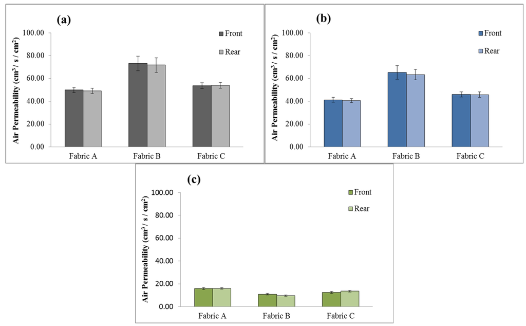 Air permeability of elastic warp-knitted fabrics (Fabrics A, B, and C) made by BC (a); PC (b) and BPC (c) ring-spun complex yarns.