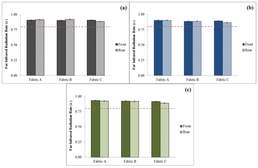 Figure 9 shows the far-infrared emissivity of three kinds of fabrics made by BC, PC and BPC ring-spun yarns. The far-infrared emissivity of fabrics made by BC yarns was slightly higher than that of PC yarns but slightly lower than that of BPC yarns. This finding can be explained by the fact that fiber assembles plied in a more compact manner had better far-infrared emissivity than those plied in a fluffier manner [32]. Combined by Figure 8, the BPC fabrics had more compact structure and higher far-infrared emissivity than the others. In addition, the front and rear faces of Fabric A had no significant difference because of the similar structure between two faces. The far-infrared emissivity of elastic warp-knitted fabrics reached >0.9 ε, which was the level of far infrared health-care effects [33].